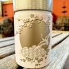 Lujosa lata de aluminio para almacenamiento de té con diseño japonés en relieve. Su elegante acabado en tono blanco y dorado presenta motivos de grullas, flores de sakura y ondas tradicionales, evocando armonía y serenidad. Ideal para conservar la frescura y el aroma de nuestro té gracias a su cierre hermético.