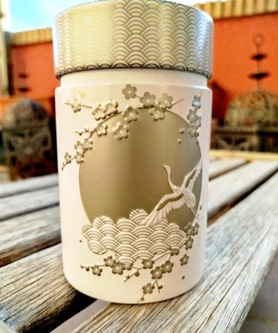 Lujosa lata de aluminio para almacenamiento de té con diseño japonés en relieve. Su elegante acabado en tono blanco y dorado presenta motivos de grullas, flores de sakura y ondas tradicionales, evocando armonía y serenidad. Ideal para conservar la frescura y el aroma de nuestro té gracias a su cierre hermético.
