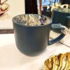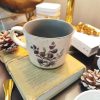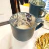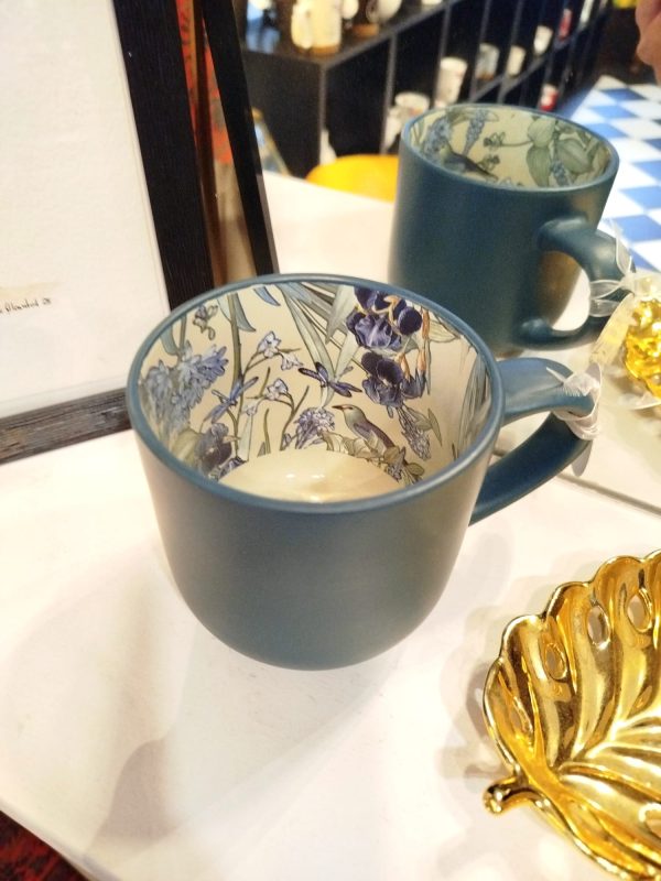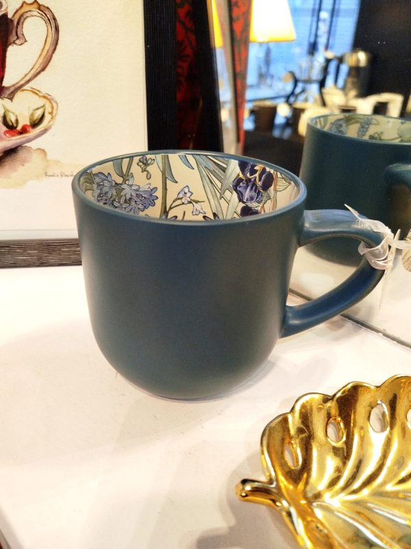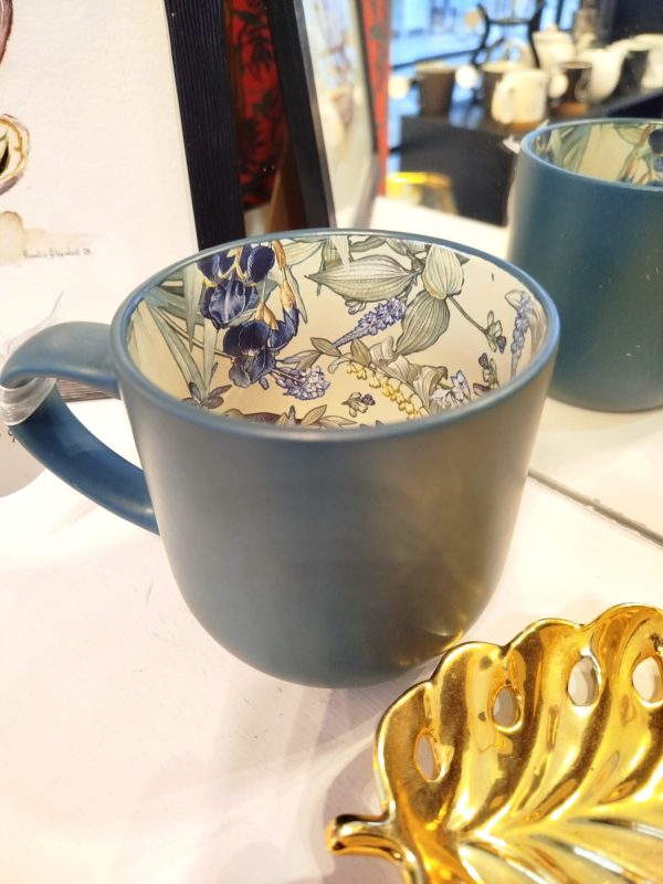 Elegante taza de cerámica en acabado mate color verde petróleo, con un delicado diseño floral en tonos púrpura y verde en su interior. Su contraste entre exterior minimalista e interior artístico la convierte en una pieza única, ideal para té e infusiones.