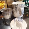 Conjunto compuesto por una taza de porcelana con diseño pintado de un elefante gris y ramas colgantes en tonos azules. Infusor de acero inoxidable con malla fina, ideal para preparar té de hojas sueltas, de forma sencilla y limpia. Tapa a juego que ayuda a mantener el calor y también sirve como base para el filtro infusor.