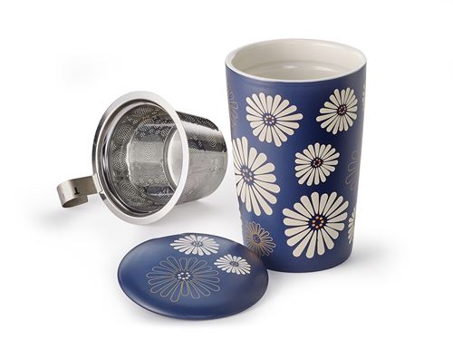 Taza de porcelana con filtro y tapa, decorada con estampado de margaritas blancas sobre fondo azul oscuro. Incluye filtro infusor de acero inoxidable tallado a láser.