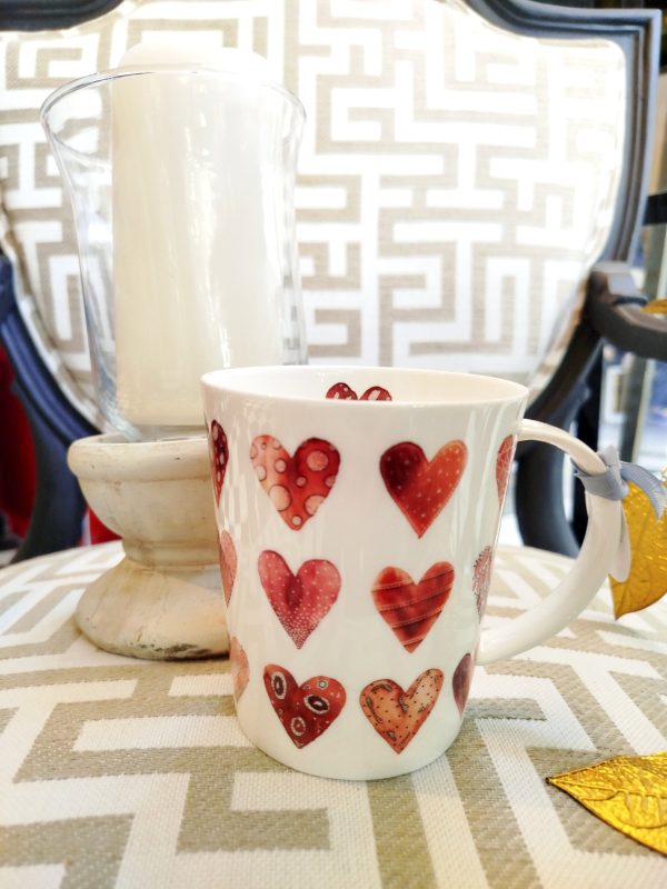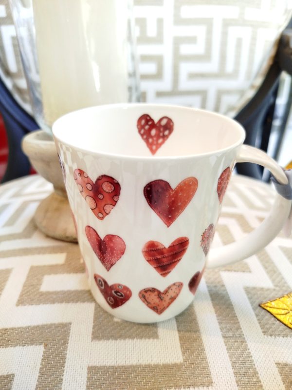 Taza de fina porcelana decorada con corazones de diversos diseños con pequeños relieves. Interior con corazón pintado. Asa con diversos corazones pintados. Pieza perfecta para regalar o disfrutar en todos nuestros momentos de serenidad.
