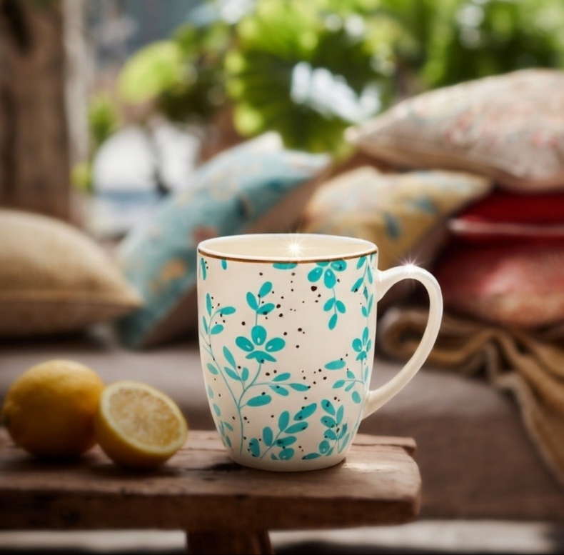 Taza de porcelana con dibujo de flores en color turquesa y borde dorado.