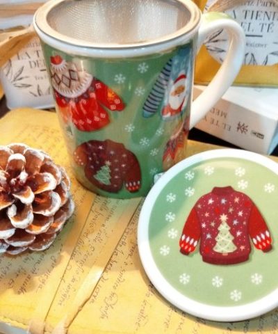 Preciosa taza para disfrutar en invierno de tu té o infusión preferida. Motivos invernales sobre fondo de color verde, hacen que desees disfrutar de la magia de la Navidad. Incluye filtro de acero inoxidable y tapa para mantener el calor durante más tiempo.