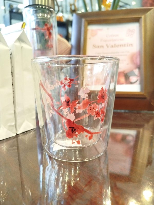 Vaso pequeño de cristal doble, perfecto para no quemarse. Precioso estampado con rama de cerezo. Ideal para ver cómo cambian de color nuestras infusiones o tés.