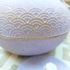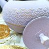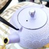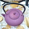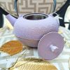 Tetera de hierro fundido en color lavanda con detalles en relieve dorados, decorada con un elegante patrón japonés de ondas (Seigaiha), símbolo de prosperidad y buena fortuna. Incluye filtro de acero inoxidable que facilita su limpieza, ideal para preparar té e infusiones con mucha tradición.