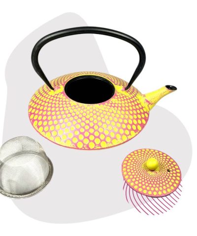 Original tetera de Hierro Fundido que combina el color limón con fresa, guardando en su diseño la esencia de las teteras japonesas. Pieza esmaltada por dentro e incluye filtro de acero inoxidable para facilitar su uso y limpieza. El hierro fundido se caracteriza por su capacidad de almacenar calor y frío durante más tiempo, una ventaja para disfrutar del té caliente durante más tiempo. También sirve para enfriar bebidas.
