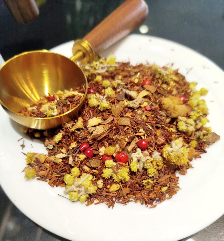 Una mezcla cálida y envolvente que combina rooibos procedente de Sudáfrica con trocitos de jengibre, dulces notas de mazapán, un toque vibrante de pimienta roja, la suavidad frutal de la mora y la calidez que proporciona un leve toque de canela y la sofisticación de pequeños trozos de oro comestible.