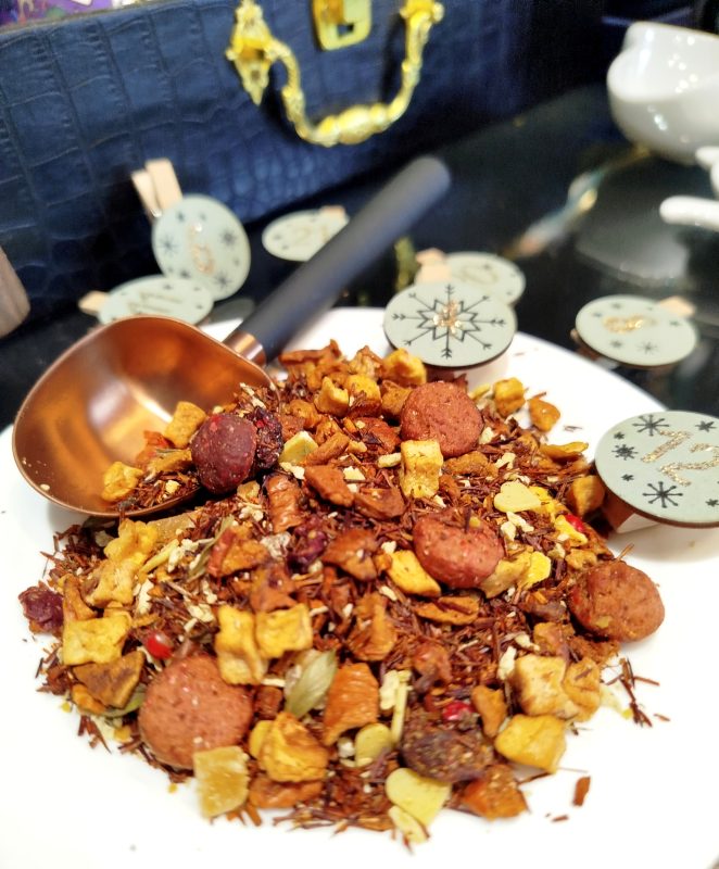 Una mezcla cálida y envolvente que combina la suavidad del Rooibos con el dulzor del mazapán, el encanto exótico de la piña y el coco y el toque goloso del cacao. Las almendras aportan una textura delicada, mientras que la manzana añade frescura y equilibrio. Sin teína y rico en aroma, es una mezcla perfecta para disfrutar en cualquier momento, con un sabor que abraza lo navideño y exótico en cada sorbo.