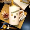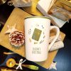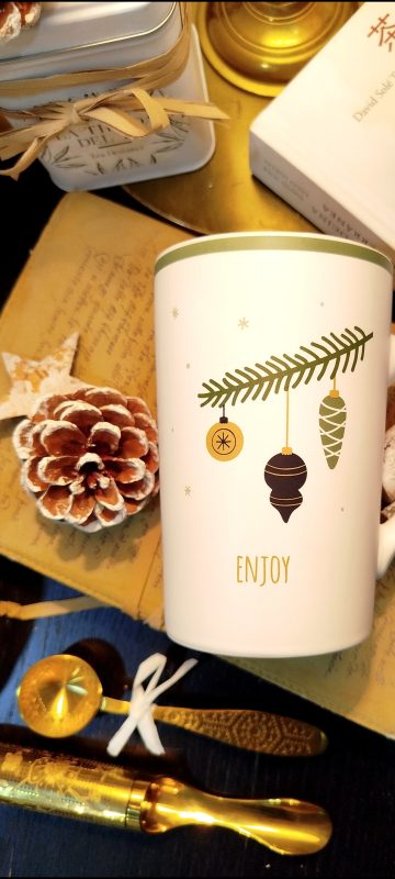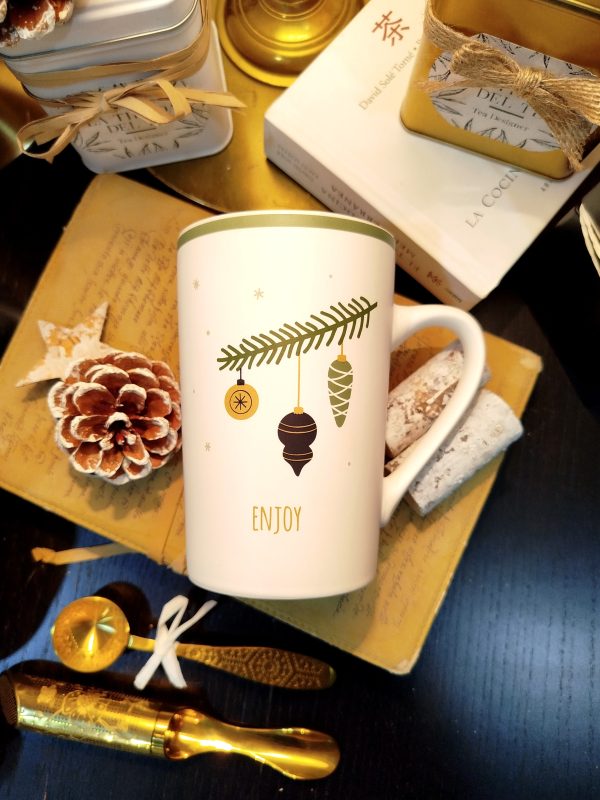 Taza de cerámica con diseño navideño, decorada con ramas de pino y adornos festivos en tonos verdes y dorados. Incluye la palabra «Enjoy» en la parte frontal y posterior. Perfecta para crear ambiente cálido esta Navidad, disfrutando de tu té o infusión favorito.